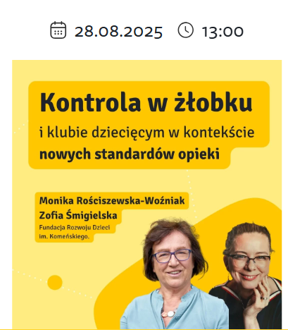 28 sierpnia 2025 r odbył się webinar, poprowadzony przez Monikę Rościszewską-Woźniak i Zofię Śmigielską z Fundacji Rozwoju Dzieci im. Komeńskiego. Zgodnie z tematem, celem spotkania było wyjaśnienie, jak przygotować placówki na wdrożenie nowych standardów opieki oraz jak wyglądać będą kontrole. Zapraszamy do wysłuchania pełnego nagrania: A poniżej przedstawiamy kluczowe informacje…...