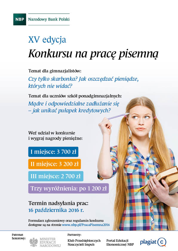 O przedsiębiorczości i oszczędzaniu zazwyczaj piszemy w kontekście edukacji przedszkolnej i programu “Przedsiębiorcze dzieci”. Dzisiaj przekazujemy propozycję skierowaną do innej grupy wiekowej – uczniów gimnazjów i szkół ponadgimnazjalnych. “Konkurs na pracę pisemną” organizuje Narodowy Bank Polski już XV raz. Zgłoszenia do 16 października! www.nbp.pl/2016/praca_pisemna/praca_pisemna.html...