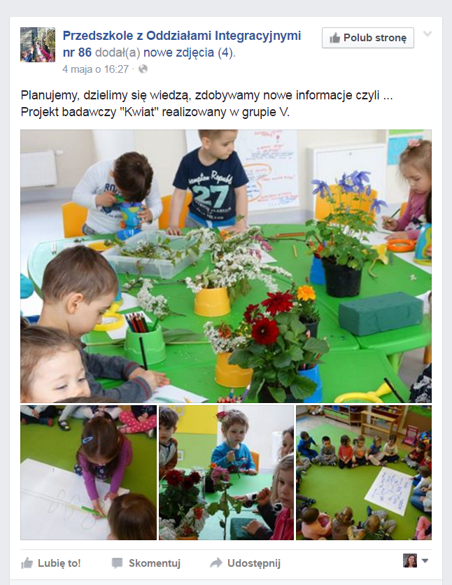 W projekcie “Mali Odkrywcy” dzieci z warszawskich przedszkoli zaczęły realizować pierwsze projekty badawcze. W zakresie ich zainteresowań znalazły się takie tematy jak woda, apteczka. Relacje z projektu kwiat w Przedszkolu nr 86 można śledzić na przedszkolnym profilu FB: https://www.facebook.com/Przedszkole-z-Oddzia%C5%82ami-Integracyjnymi-nr-86-666880290023905/ Już niebawem zamieścimy szczegółowe informacje o zrealizowanych projektach. ...