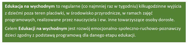 Edukacja na wychodnym nie polega na tworzeniu nowego programu dydaktyczno-wychowawczego. Wychodzenie z dziećmi w środowisko przyrodnicze powinno być zaplanowane, jako część istniejącego programu edukacyjnego grupy przedszkolnej lub klasy szkolnej. Program nauczania musi być zgodny z podstawami programowymi dla danego etapu edukacji. Proponujemy następującą definicję edukacji na wychodnym:
