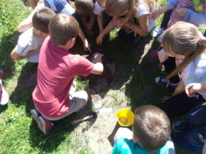 Kacper razem z kolegami bawi się miednicą z wodą. W miednicy pływają „rybki” – baloniki napełnione solą, piachem, powietrzem. Dzieci nie miały problemu z zaobserwowaniem, co tonie, a co pływa, ale nie potrafiły sformułować ogólnej zasady dotyczącej doświadczenia.